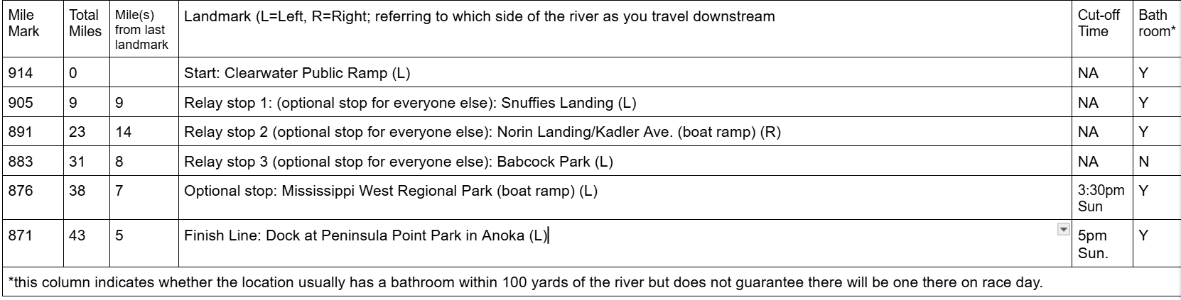 Minnesota DNR Mississippi River maps 8 & 9 cover the event route and show all the landmarks in the chart below (and additional access points), and available at this link: Mississippi River State Water Trail